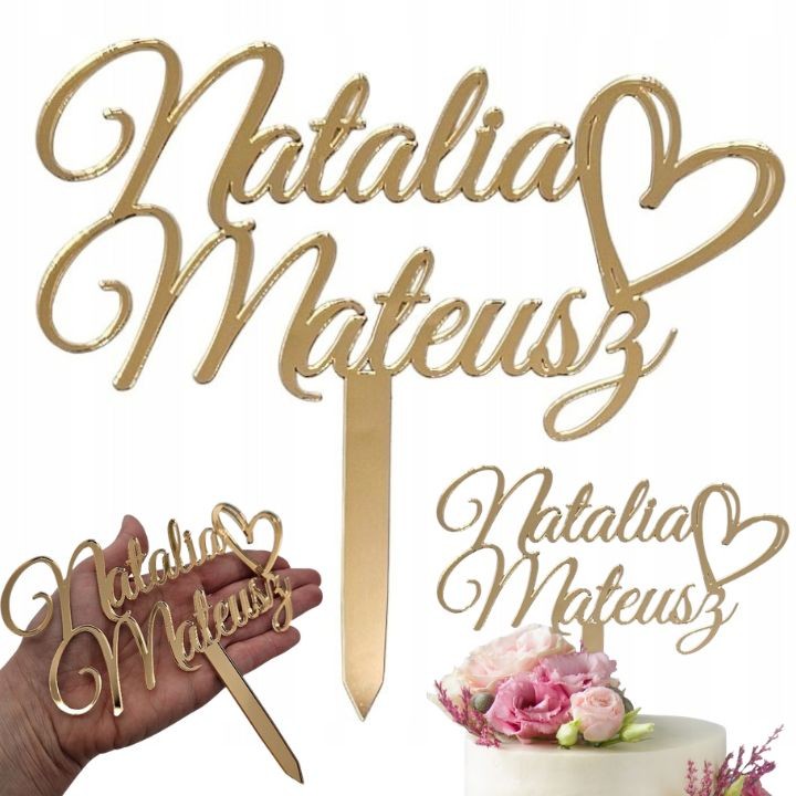 Elegancki złoty Topper na tort ślubny z imionami pary młodej to wyjątkowa ozdoba, która dodaje blasku i prestiżu każdemu tortowi. Wykonany z wysokiej jakości złotego lustra plexi, ten topper jest perfekcyjnym dodatkiem do romantycznego przyjęcia ślubnego.