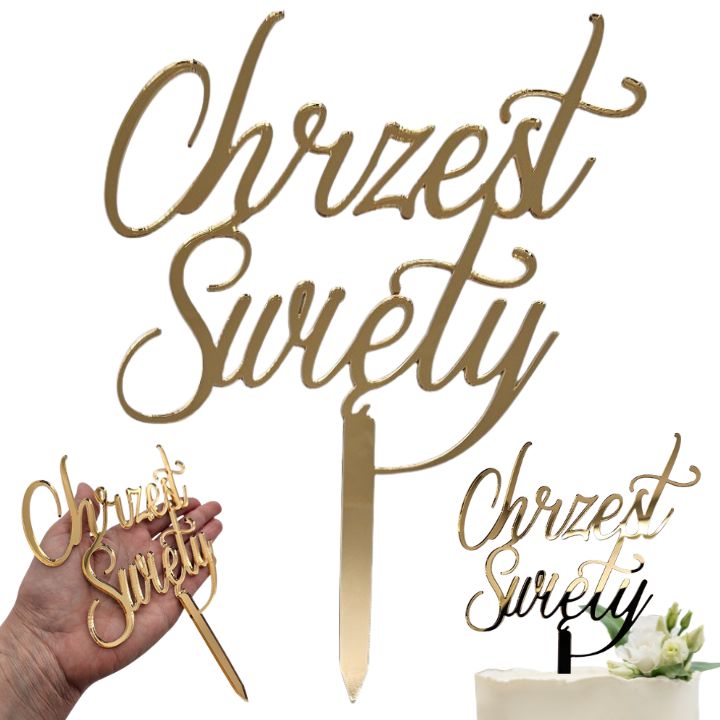 Nasz topper na tort został starannie wykonany z wysokiej jakości złotej lustrzanej błyszczącej plexi, co nadaje mu nie tylko elegancji, ale również trwałości. Piękna rustykalna czcionka, w jakiej został wykonany napis "Chrzest Święty", dodaje mu dodatkowego uroku i nadaje całości wyjątkowego charakteru.