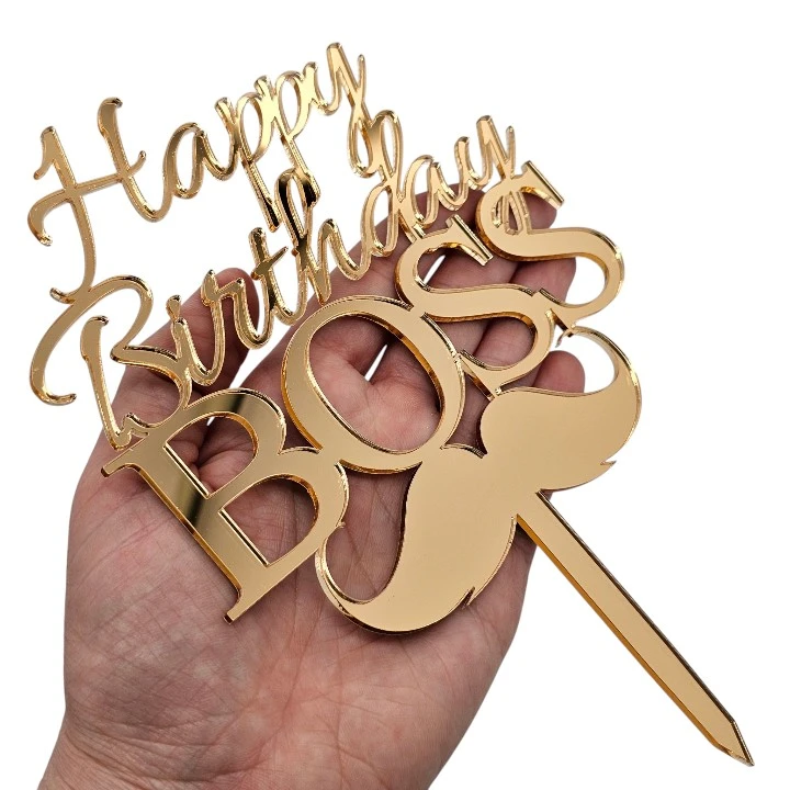 Złoty topper na tort urodzinowy Happy Birthday BOSS z wąsem