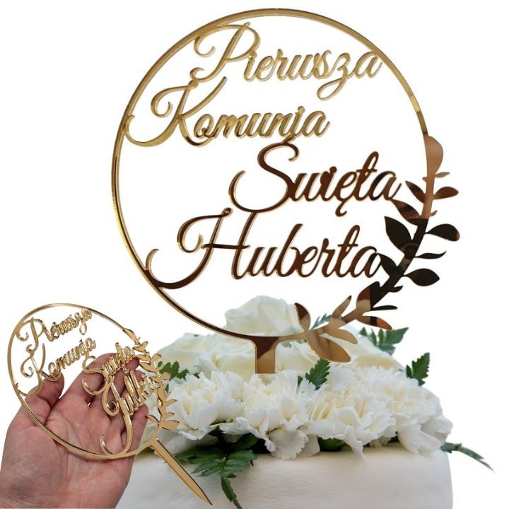Złoty topper na komunię, przeznaczony do umieszczenia na torcie, prezentuje się wyjątkowo elegancko i symbolicznie. Wykonany ze złotej lustrzanej plexi, ten topper jest zarówno ozdobny, jak i trwały. Centralnym elementem designu jest napis "Pierwsza Komunia Święta" umieszczony w okręgu, otoczony ozdobnymi listkami, co nadaje całości subtelnego uroku. Dodatkowo, imię dziecka jest umieszczone w centralnym punkcie, nadając personalizacji i wyjątkowego charakteru.